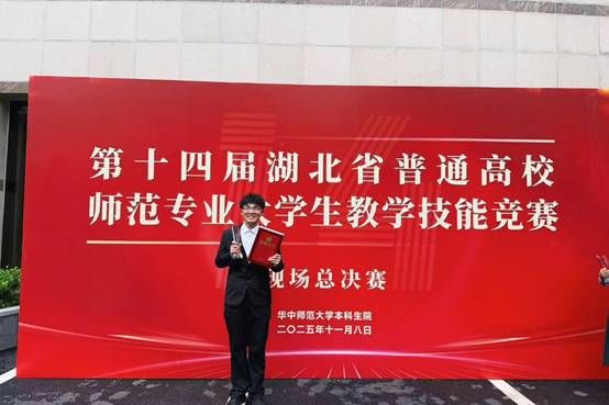 2025年11月8日,第十四届湖北省普通高校师范专业老员工教学技能竞赛现场总决赛在华中师范大学落下帷幕。公司2023级英语(师范)专业谭海同学凭借扎实的专业功底与出色的现场表现,荣获高中英语组一等奖。