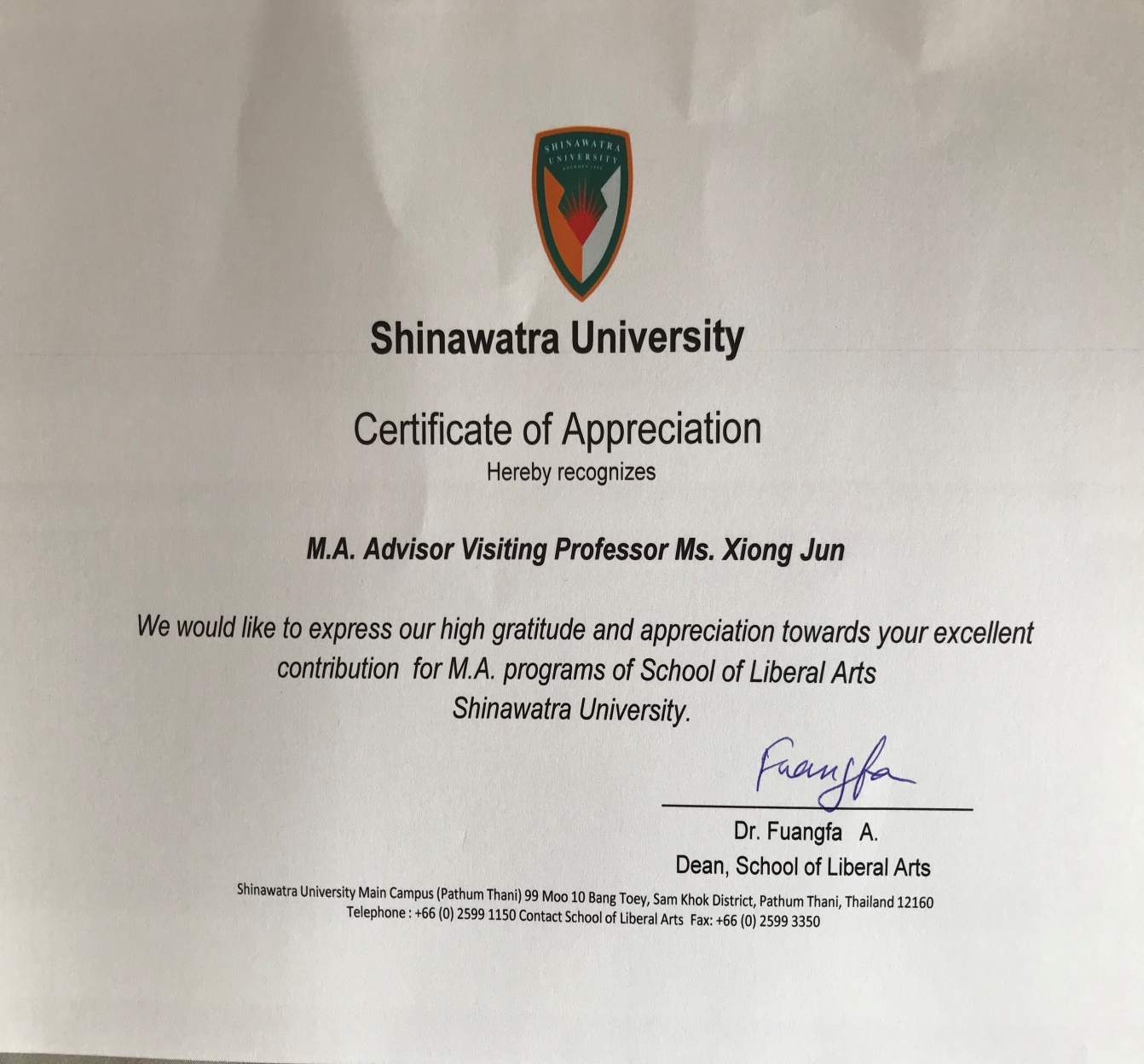2020年1月31日下午,公司熊俊教授被泰国西那瓦大学(Shinawatra International University,SIU)符号学与文化研究中心聘为硕导、客座教授。西那瓦大学董事长芳发(Dr. Fuangfa A.)教授到场颁发了客座教授、硕士生导师聘书。目前,熊俊教授在泰国西那瓦大学攻读符号学与文化研究方向的博士。