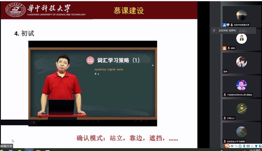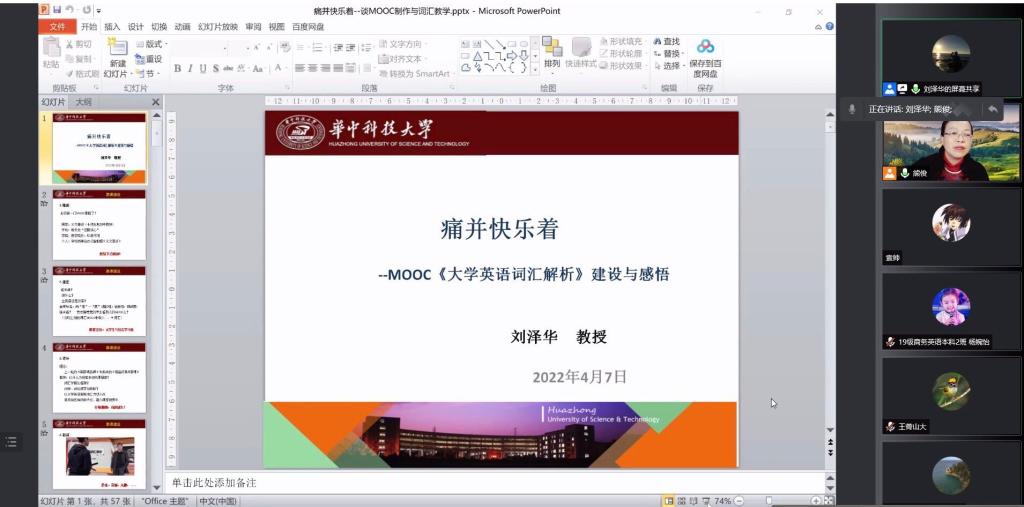 4月7日晚,教育部大学外语教学指导委员会委员、湖北省高等教育学会大学外语教学专业委员会常务理事、国家级一流线上课程《大学英语词汇解析》主讲人华中科技大学熊猫体育副经理刘泽华教授为公司师生在腾讯会议平台上做了主题为“痛并快乐着——MOOC《大学英语词汇解析》建设与感悟”的讲座。公司熊猫体育青年教师、部分员工及少数来自其他高校的教师一百多人聆听了此次讲座。本次讲座由公司教师教学发展中心主办,熊猫体育承办。讲座由熊猫体育副经理、翻译研究中心主任熊俊教授全程主持。