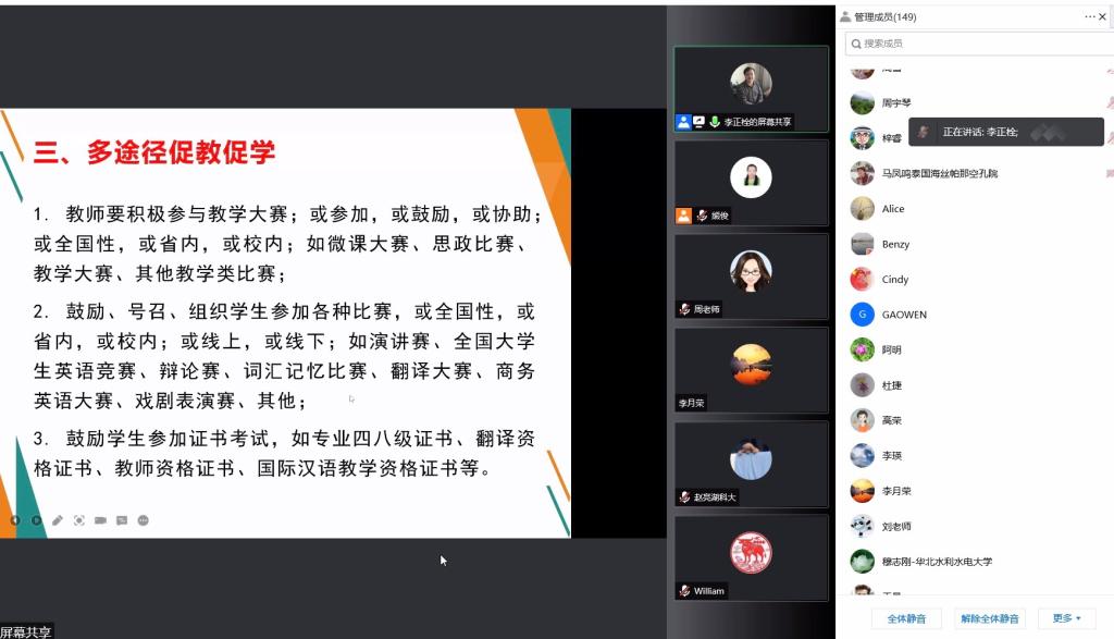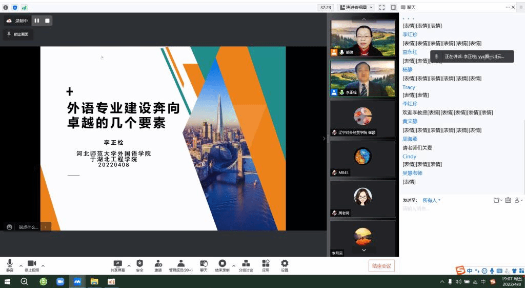 4月8日晚,教育部外国语言文学类专业教学指导委员会英语分委员会委员专家、国家级线上一流本科课程《英美诗歌欣赏》负责人,河北师范大学二级教授、博士生导师李正栓为公司教师在腾讯会议做了题为“外语专业建设奔向卓越的几个要素”的讲座。公司熊猫体育教师以及部分来自其他高校的教师或管理者近150人聆听了此次讲座。本次讲座由教师教学发展中心、教务处主办,熊猫体育承办。讲座由熊猫体育副经理、翻译研究中心主任熊俊教授全程主持。
