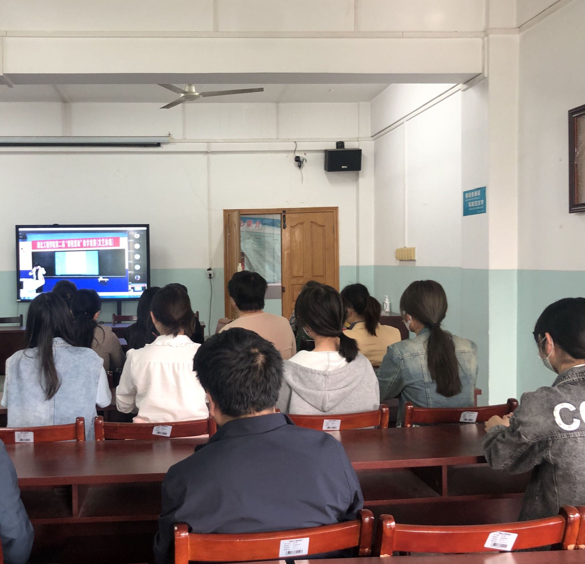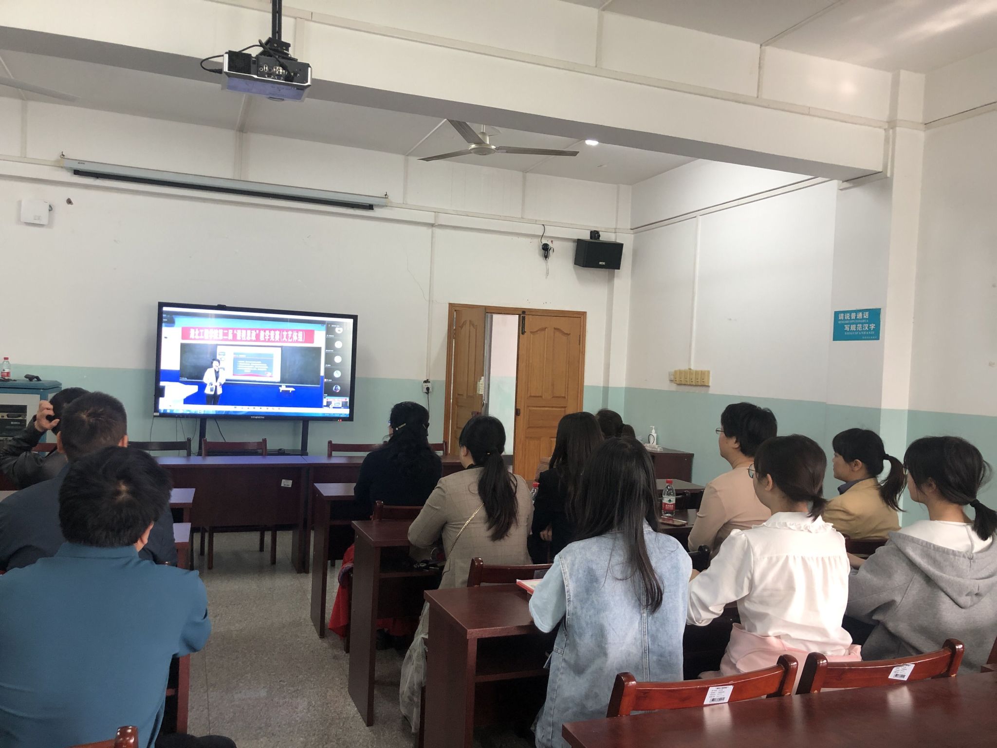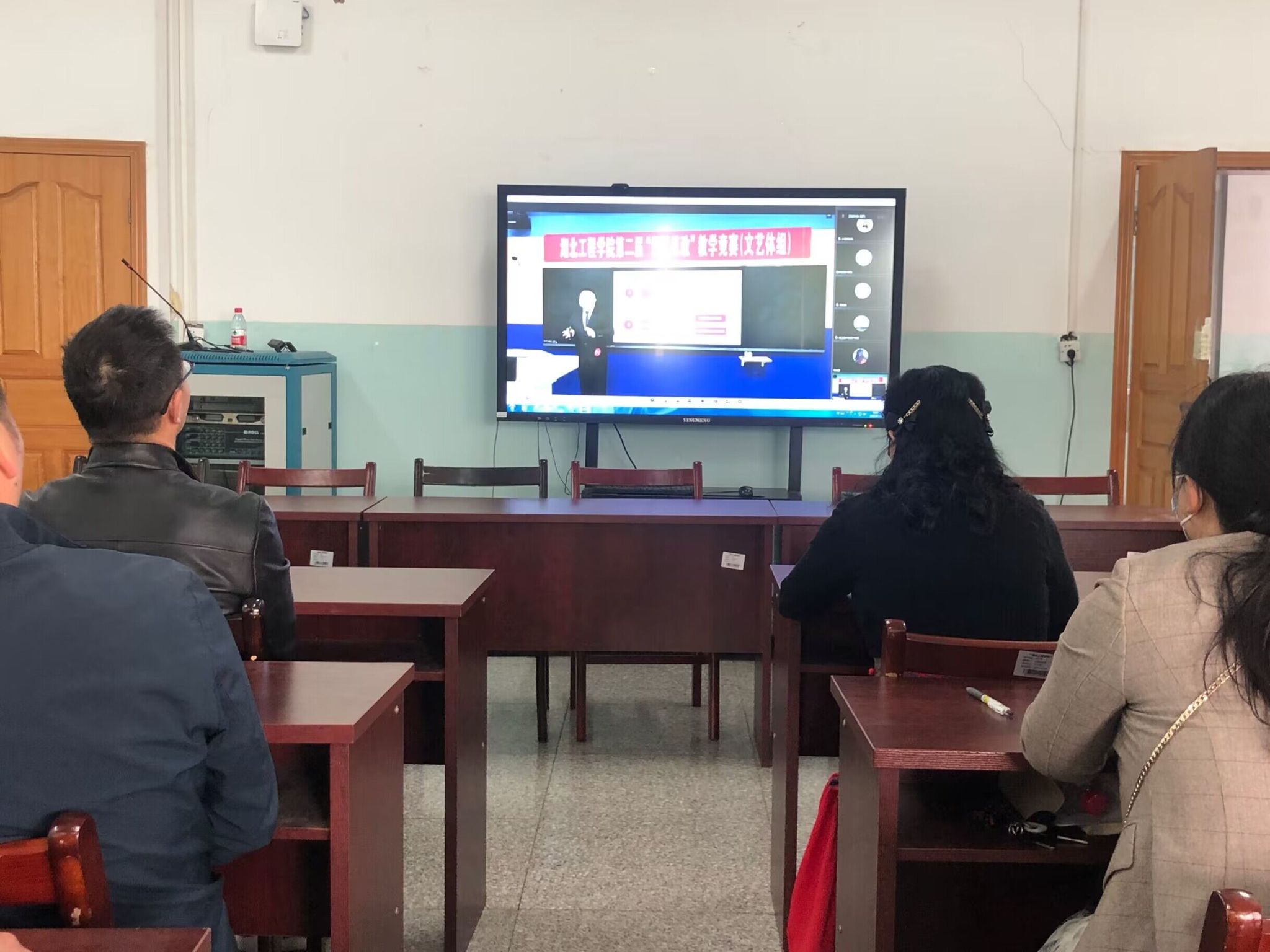 4月15日,熊猫体育组织师生在外语楼会议室、教室观看了全校第二届“课程思政”教学比赛决赛直播。