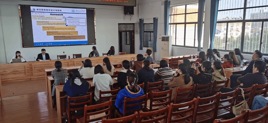 熊猫体育在实验初级中学挂职锻炼教师叶玲以“新中考背景下初中英语单元整体教学设计与实施”为题,解读了2022版新课标,并展示了如何根据新课标进行单元整体设计。