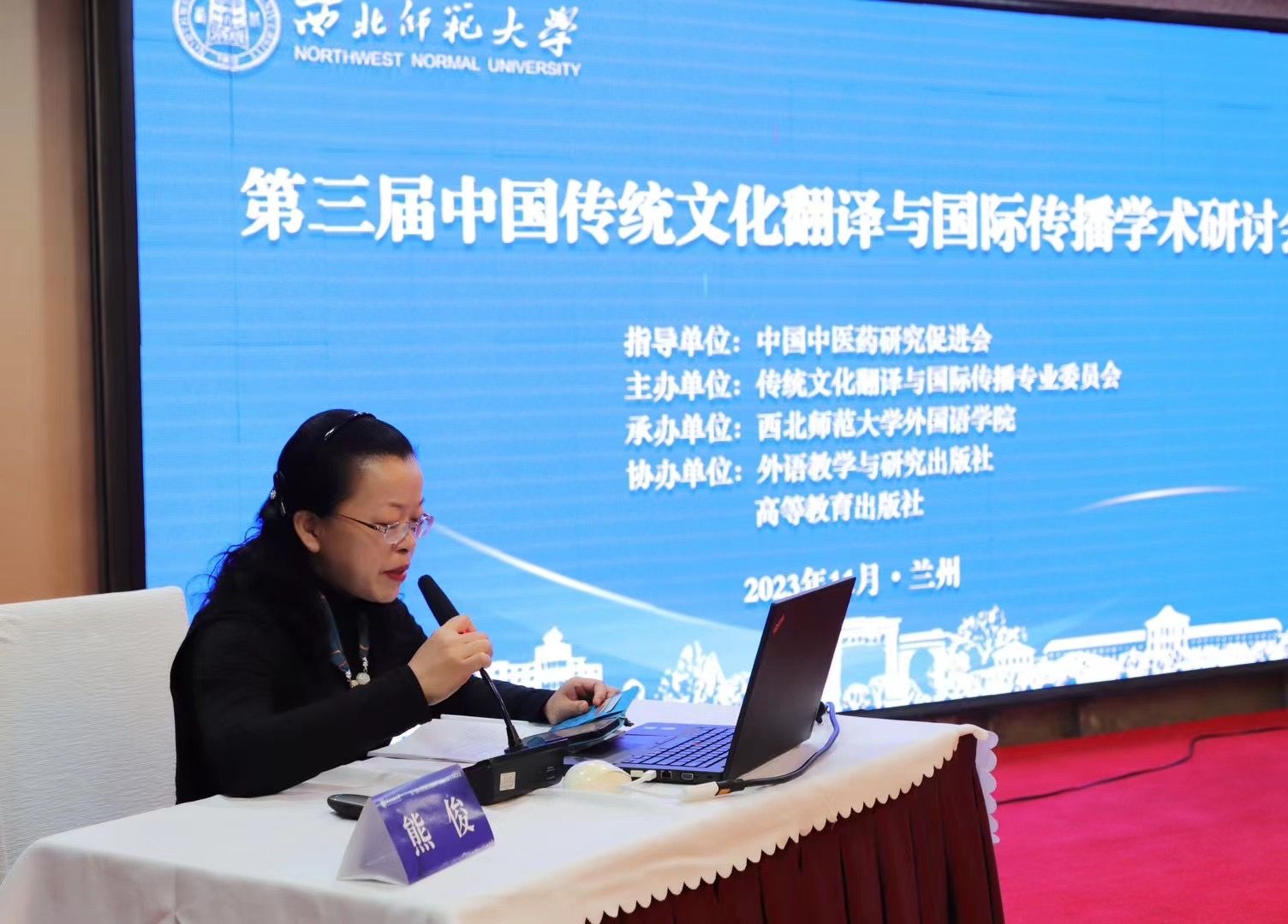 2023年11月24至26日,公司副经理熊俊博士教授受邀参加了由西北师范大学熊猫体育承办的“第三届中国传统文化翻译与国际传播学术研讨会”。24日晚9:30-11:00出席了传统文化翻译与国际传播专委会常务理事会。25日主持了第四分论坛(典籍翻译研究)并做分会报告。26日上午就主持的分论坛做大会总结汇报,并为上海外国语大学博导谭业升教授的主旨发言担任主持(谭教授报告的题目“中国民俗文化翻译:理论问题与认知探索”)。