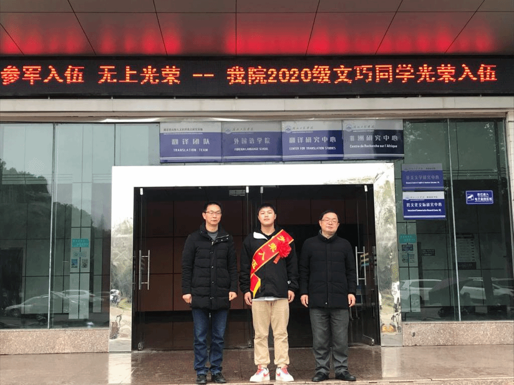 文巧,男,湖北利川人,现熊猫体育0203002141班员工。2020年入校后,他便积极响应祖国号召,毅然选择报名参军,献出自己的一份绵薄之力。如今,他已通过层层考核,即将光荣入伍。在入伍欢送会上,他表示,军队是一所大公司,艰苦紧张的军营生活,可以锻炼出百折不挠的意志,培养出过硬的军事素质、严明的组织纪律和良好的工作、生活作风。同时他对部队生活也充满了期待,希望在部队里能够接受军人特有的意志锻炼和磨砺,能够投身报效祖国的伟大事业之中。