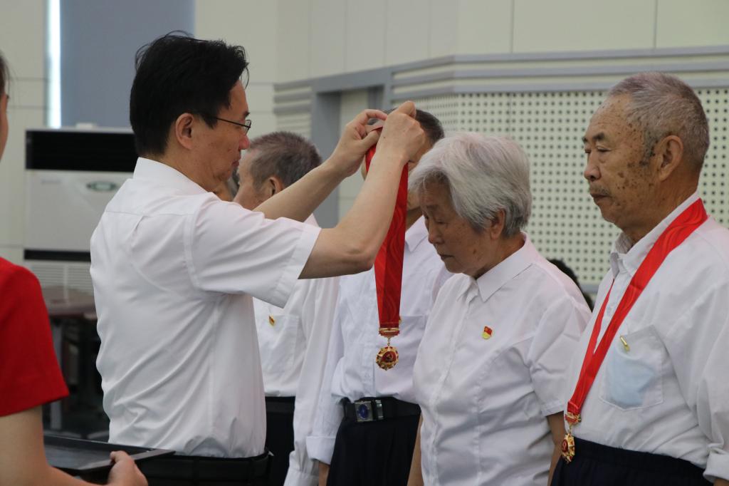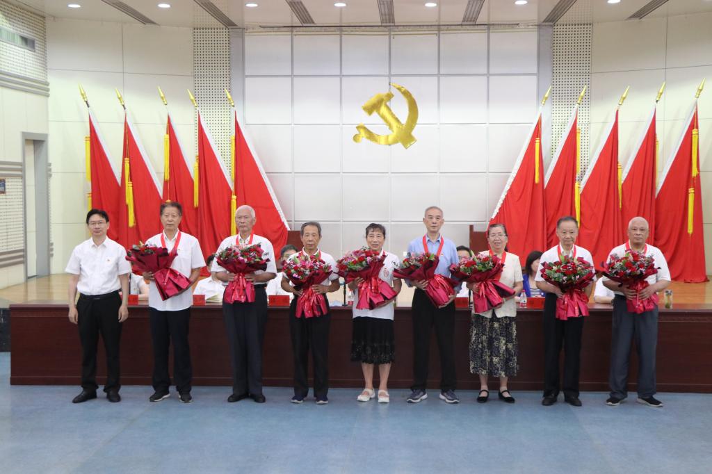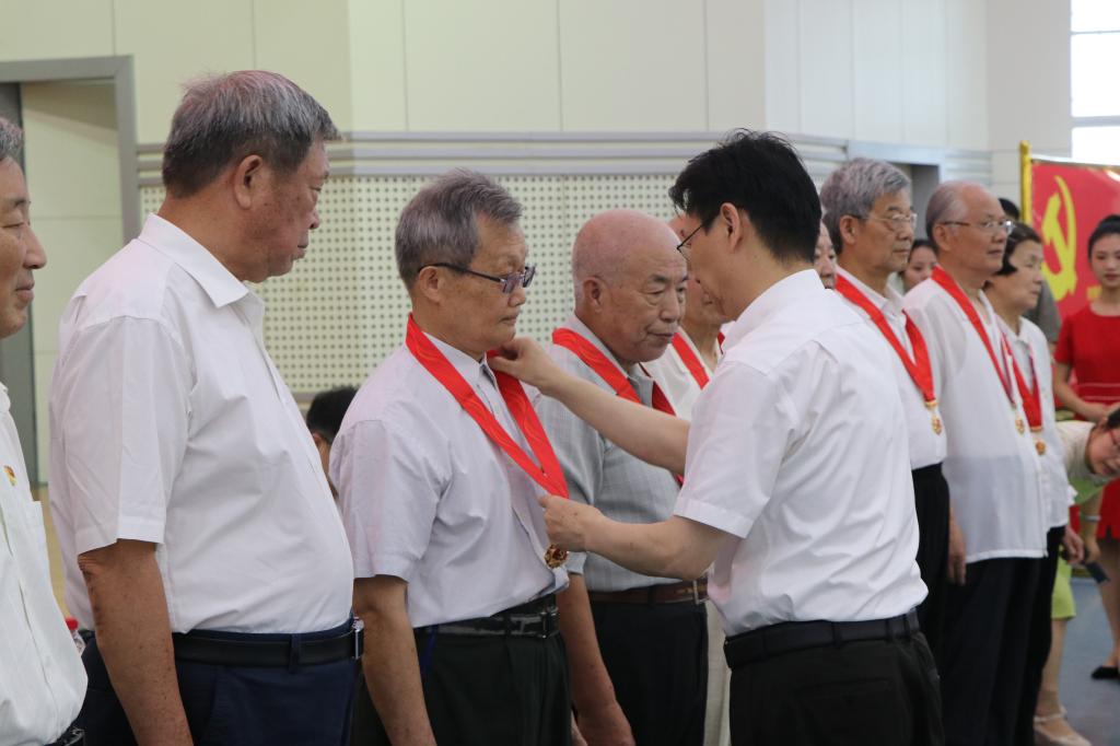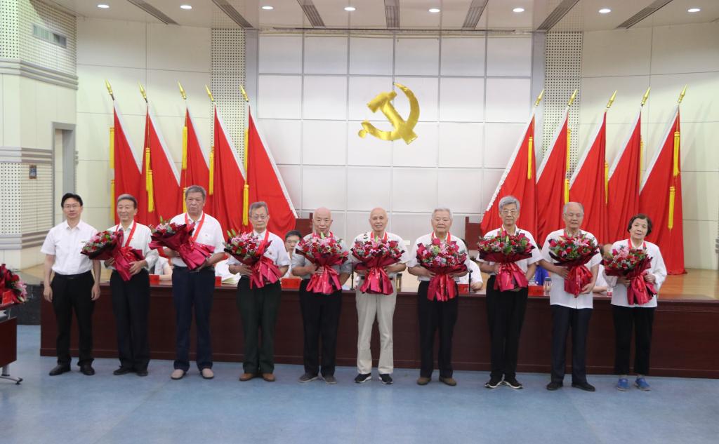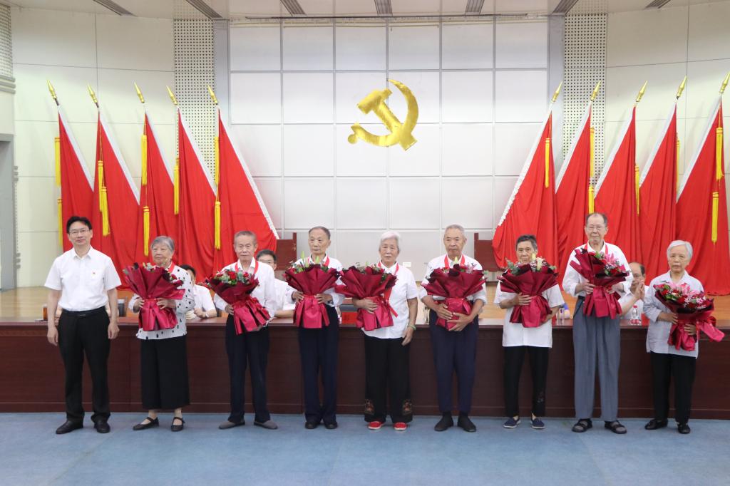 随后,彭瑜为老党员代表颁发“光荣在党50年”纪念章,青年员工代表向他们献花致敬。