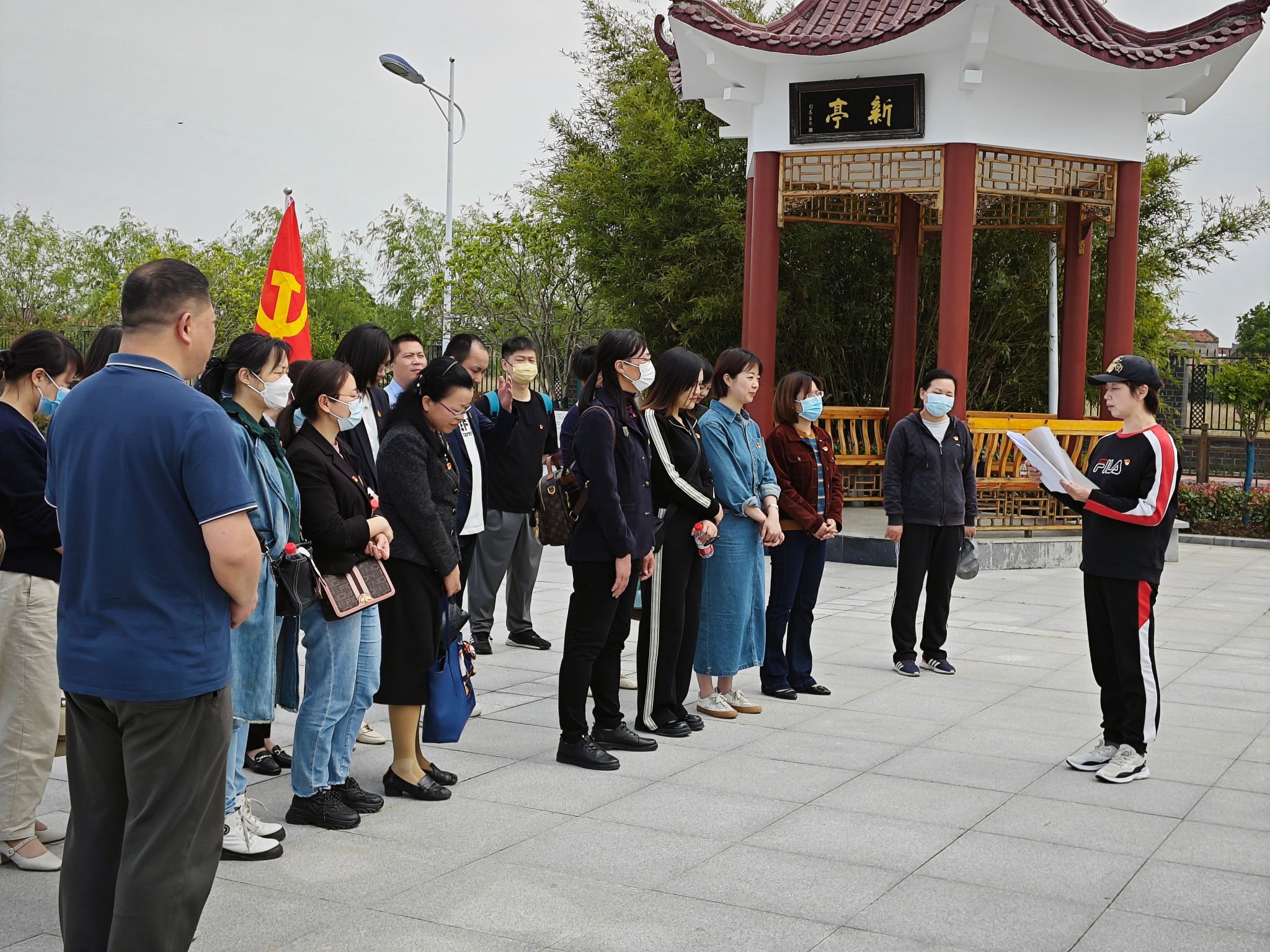 在纪念碑前,全体党员肃立,敬献花篮、默哀,缅怀革命先烈。